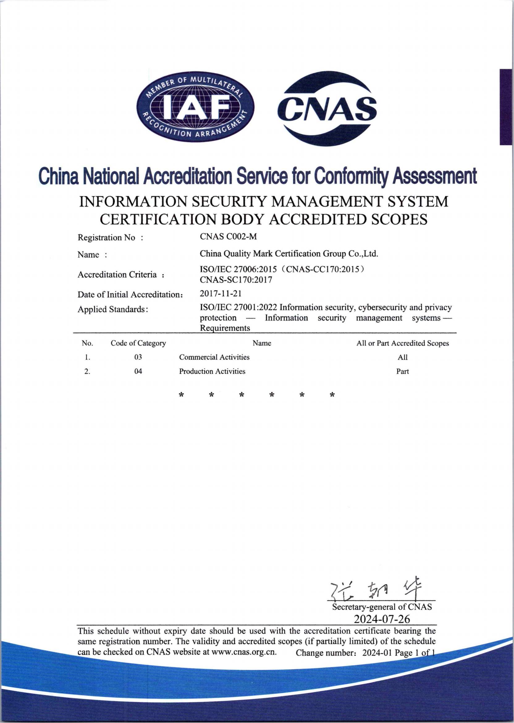 信息安全管理體系認證認可證書