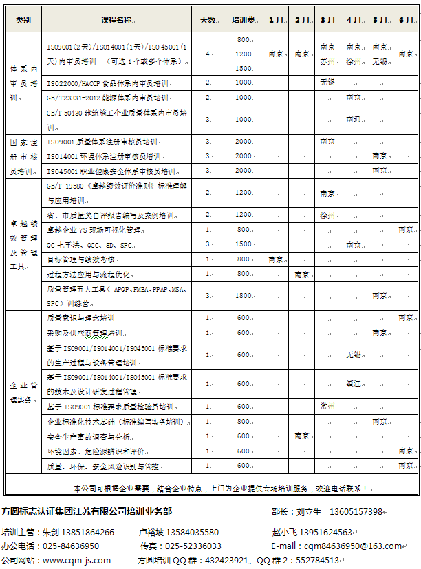 江蘇公司2019年公開班培訓計劃(1-6月份)