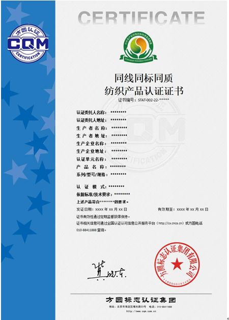 方圓標志認證集團(英文簡稱CQM)現已開展“同線同標同質”(以下簡稱“三同”)紡織產品認證業務。即日起企業可通過CQM用戶平臺在線提交認證申請,申請路徑:http://pc.cqm.cnà填寫申請à初次申請à請選擇業務類別:聯盟認證/區域品牌認證à請選擇認證領域:“三同”產品à請選擇產品大類:(P47)“三同”產品à請選擇產品小類:(1800-05)“同線同標同質”紡織產品。